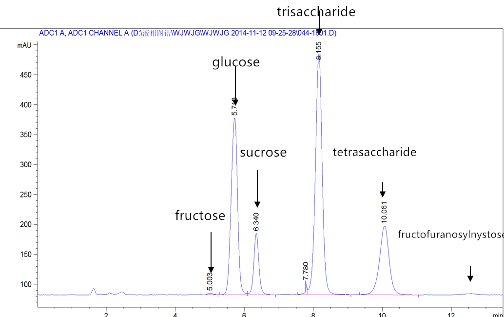 En la producción de oligofructosa, la concentración de sacarosa es del 60% (p/v). Una vez disuelto la materia prima, ajuste el pH a 5.5, mantenga la temperatura a 55-60 ℃ y agregue fructosiltransferasa. La dosis recomendada es de 0.5 l/t sacarosa (base seca), y el tiempo de transglucosación es de 16 horas. Finalmente, obtenemos los siguientes resultados de contenido: 0.99% fructosa, 28.66% de glucosa, 12.33% de sacarosa, 36.35% de trisacárido de fruta de caña y 21.68% de tetrasacárido de fruta de caña.